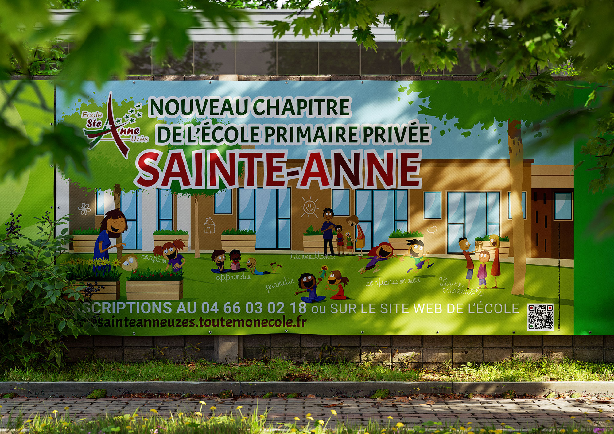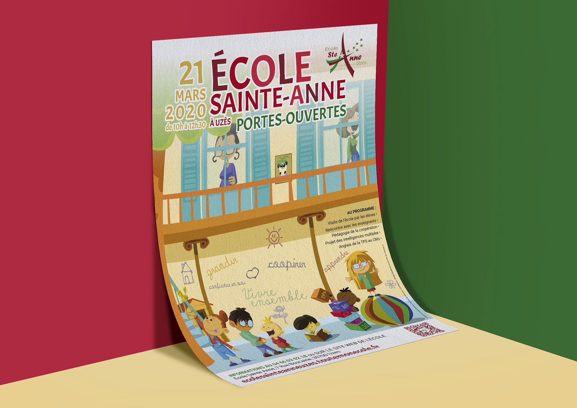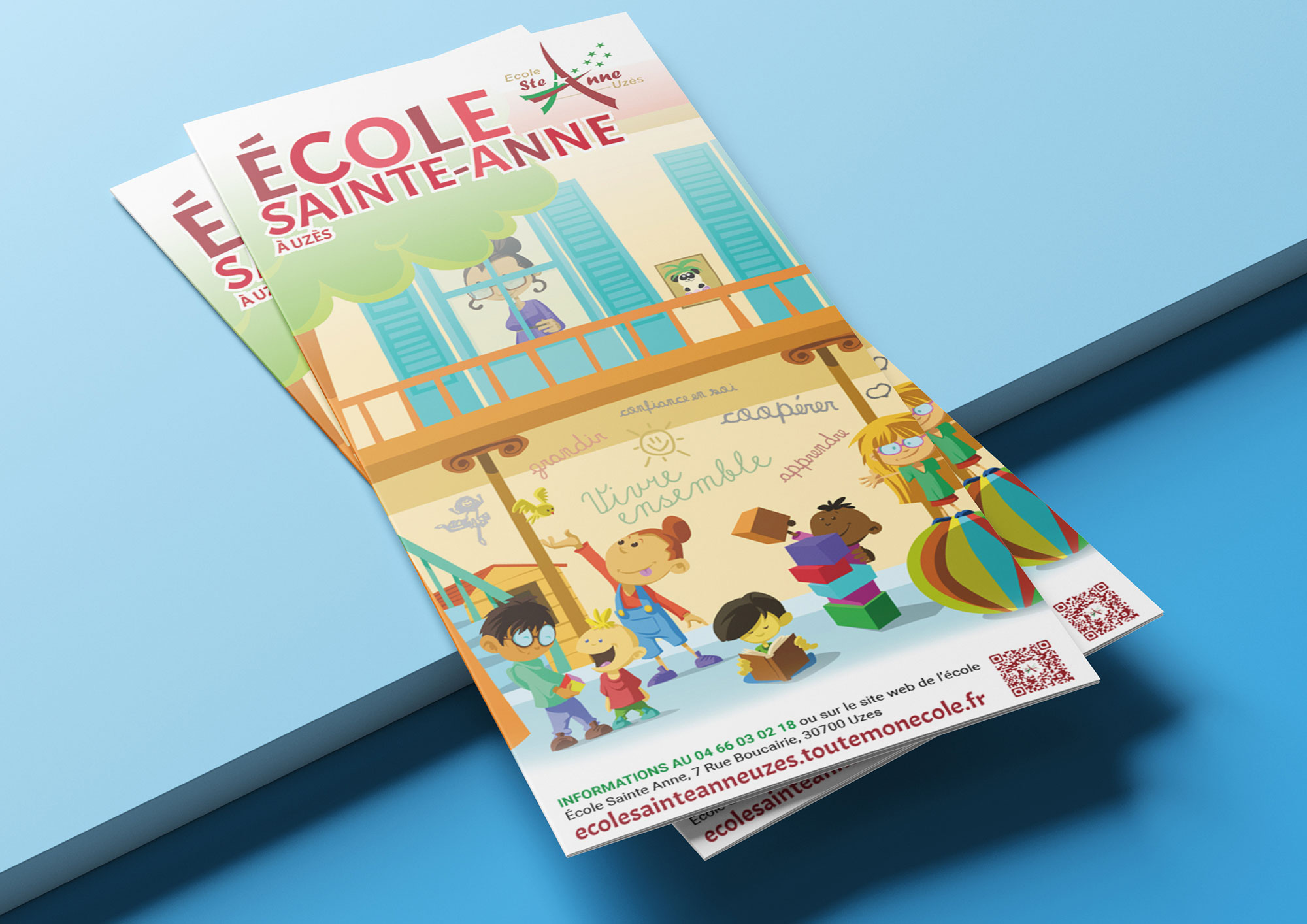 Créations visuelles pour l’École Sainte-Anne : Affiche, Dépliant, Flyers, Panneaux, Vidéo promotionnelle. Client : École Sainte-Anne (Uzès)